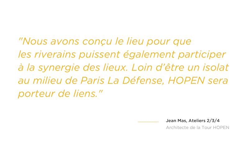 Derrière cette identité renouvelée, HOPEN s’intègre pleinement dans l’ambition de Paris La Défense de devenir le premier quartier d’affaires « post-carbone ».