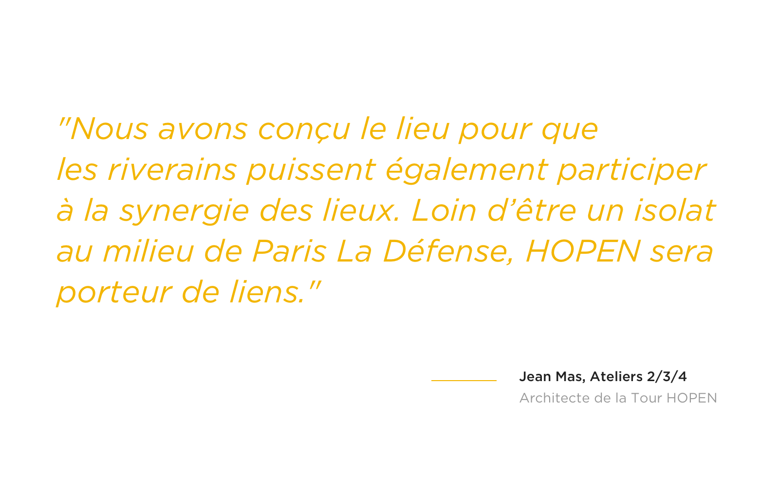 Derrière cette identité renouvelée, HOPEN s’intègre pleinement dans l’ambition de Paris La Défense de devenir le premier quartier d’affaires « post-carbone ».